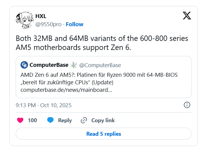 根據早前 ASUS 公佈的資料顯示,Zen 6 與 64MB BIOS 兼容,引發了外界對於 32MB BIOS 主機板是否支援 Zen 6 的討論。不過,知名爆料者 @9550Pro(HXL)進一步透露,Zen 6 將同時支援 32MB 和 64MB BIOS 晶片版本的 AM5 主機板,這意味著包括 600 系列和 800 系列主機板在內的現有 AM5 設備都可以兼容 Zen 6 處理器。