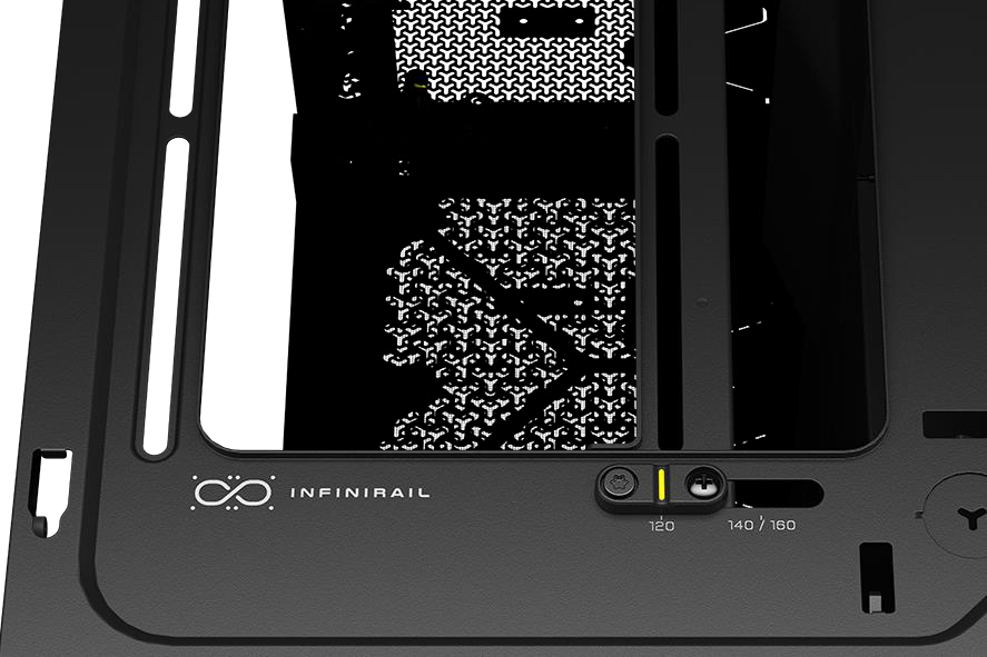 FRAME 5000D 有黑色和白色兩種顏色可供選擇,由於採用了 CORSAIR InfiniRail 風扇安裝系統,風扇的安裝和調整變得非常簡單,該系統允許靈活地放置風扇,並包括易於調節的導軌以適應常見的風扇尺寸,確保高階組件的最佳散熱效能。無論使用 120 mm、140/160 mm,甚至 200 mm 風扇,InfiniRail 系統都能提供無與倫比的靈活性和易用性。