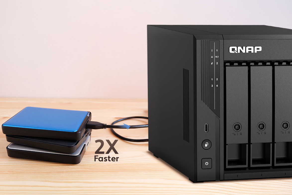 針對不同的應用程式及更多的用戶同時存取,全新 QuX05 系列更預載 16GB DDR5 記憶體,滿足高效能需求,對於一般家用或中小企來說已經足夠,省卻日後升級的不便。此外,內建兩個 M.2 SSD 插槽可用於安裝 NVMe SSD,能夠按需要選擇作為快取加速還是高速存儲池,都能顯著提升隨機讀取性能,對於需要經常存取大量檔案會更加流暢。QuX05 的網絡連接配備雙 2.5GbE,支援 SMB Multichannel 及 Port Trunking,只需要配搭支援的 Switch 或 Router,即可達到更高的資料傳輸速度與穩定性。對於多媒體應用場景,QuX05 支援 HDMI 2.1 輸出,能以 4K 直接連接至熒幕或電視,實現即時多媒體播放。另外,機身前方的 USB 亦升級為 USB 3.2 Gen2 Type-C,以支援最新的 Type-C 外置儲存裝置,配搭一鍵備份功能方便把外置儲存裝置的資料與 NAS 同步,而機身背面則配搭 2 個 USB 3.2 Gen2 Type-A。