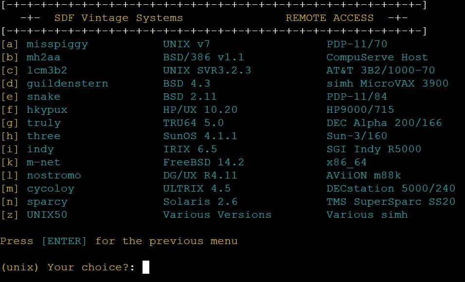 用戶只需通過瀏覽器訪問「connect.sdf.org」,輸入「menu」來獲得訪客權限,即可進入系統選單。該選單分為三列,分別顯示選擇指令、操作系統名稱及其硬體描述。通過選擇對應的指令,用戶可以體驗這些混合了真實硬體、模擬器及歷史系統的經典設備。